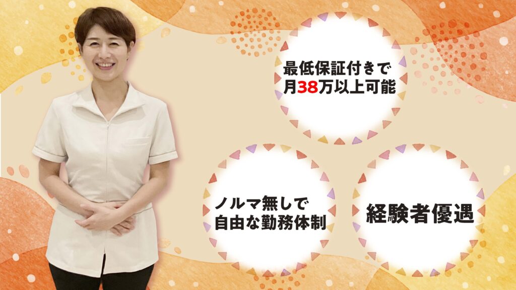 | 給与 | 業務委託 60分 3,200円~4,000円 完全歩合制+1日1万円の最低保証付き(ノルマなし) |
